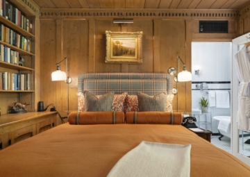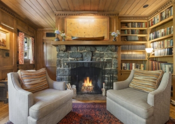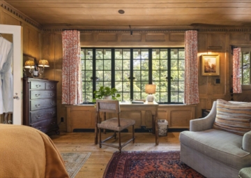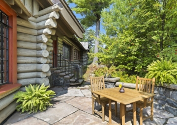 A private door leads outside to the front terrace or down the wooded slope to the lake.