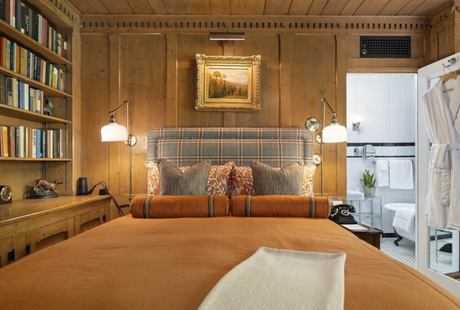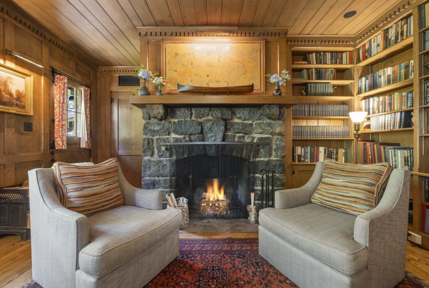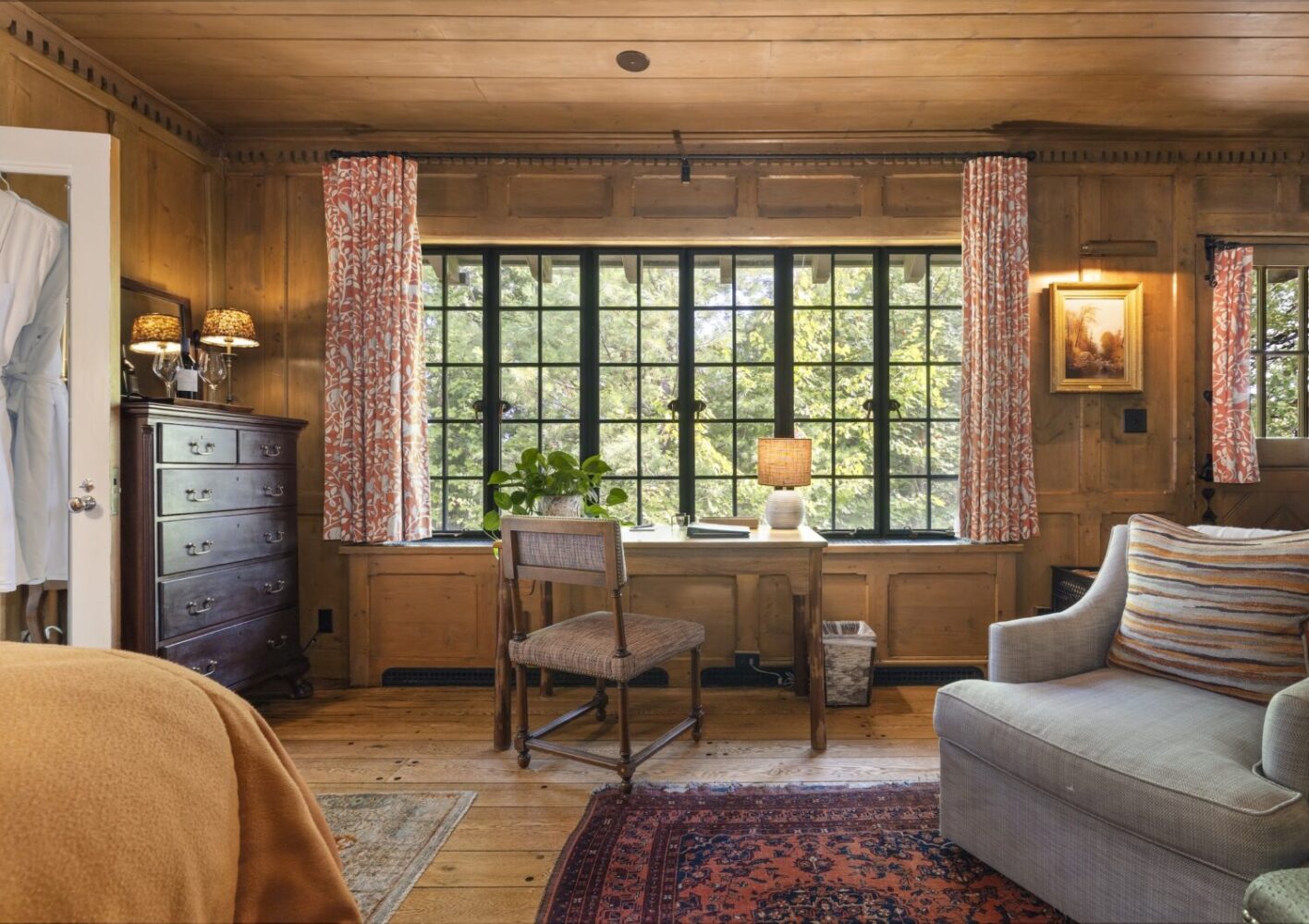 A private door leads outside to the front terrace or down the wooded slope to the lake.
